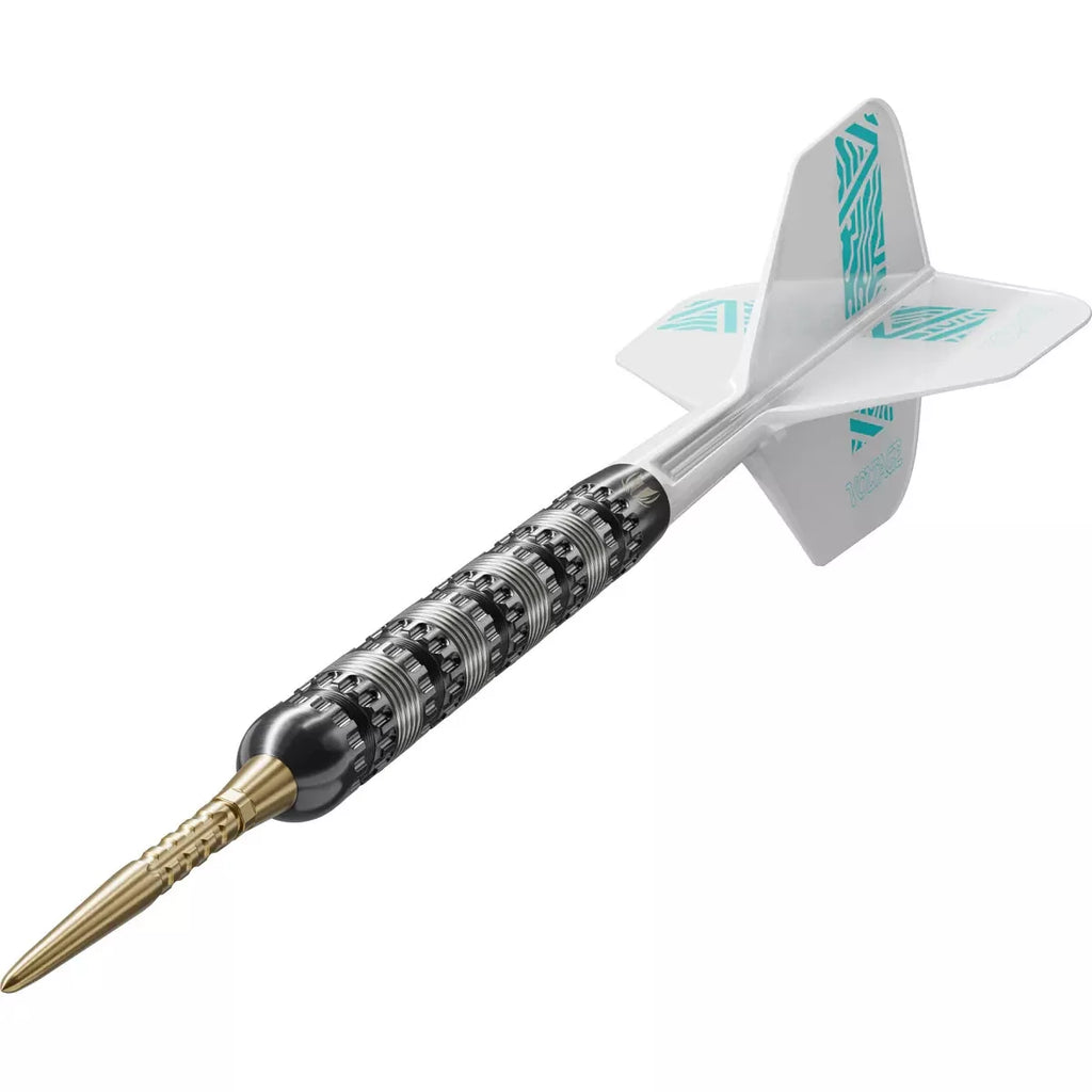 The Rob Cross 95K steel tip dart set includes Target's Swiss Storm Surge Points in an eye-catching gold finish, providing an enhanced grip on dartboards while adding a touch of luxury. The patented Swiss Point system enables effortless point switching, so players can customize their setup with confidence. With a choice between 26mm and 30mm Swiss Storm Surge points, players can tailor the dart length for maximum precision. A premium Swiss Point keyring tool is included for easy adjustments.