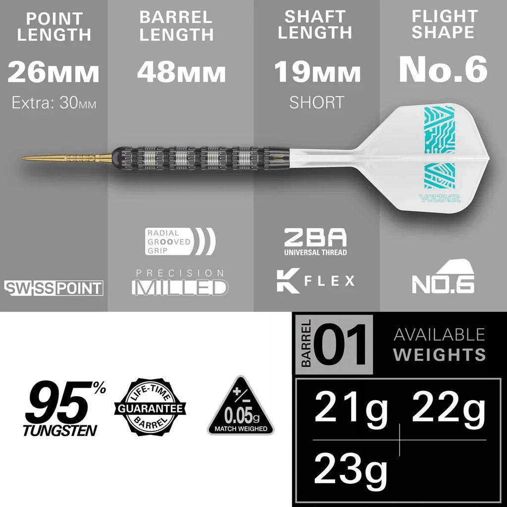 Each dart barrel is crafted with 95% tungsten, ensuring a compact, dense profile that delivers superior control and precision. The barrels feature a straight black design with a precision milled grip and radial grooves, offering optimal traction for consistency in every throw.